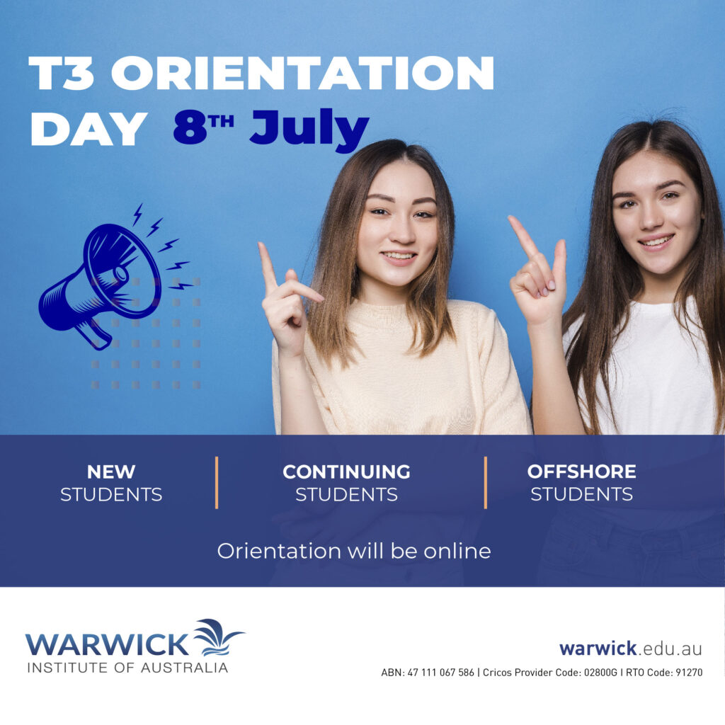 A kind reminder, T3 Orientation Day will be on Thursday 8th July admin 4 years ago A kind reminder, T3 Orientation Day will be on Thursday 8th July NEW STUDENTS CONTINUING STUDENTS OFFSHORE STUDENTS Orientation will be online For more information, donβt hesitate to contact us. info@warwick.edu.au