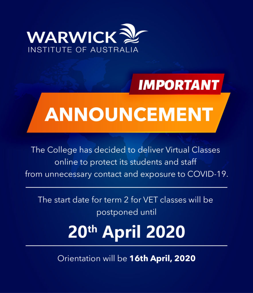 Warwick Institute of Australia, while not having any cases of COVID-19, has decided to deliver Virtual Classes online to protect its students and staff from unnecessary contact and exposure to COVID-19.
