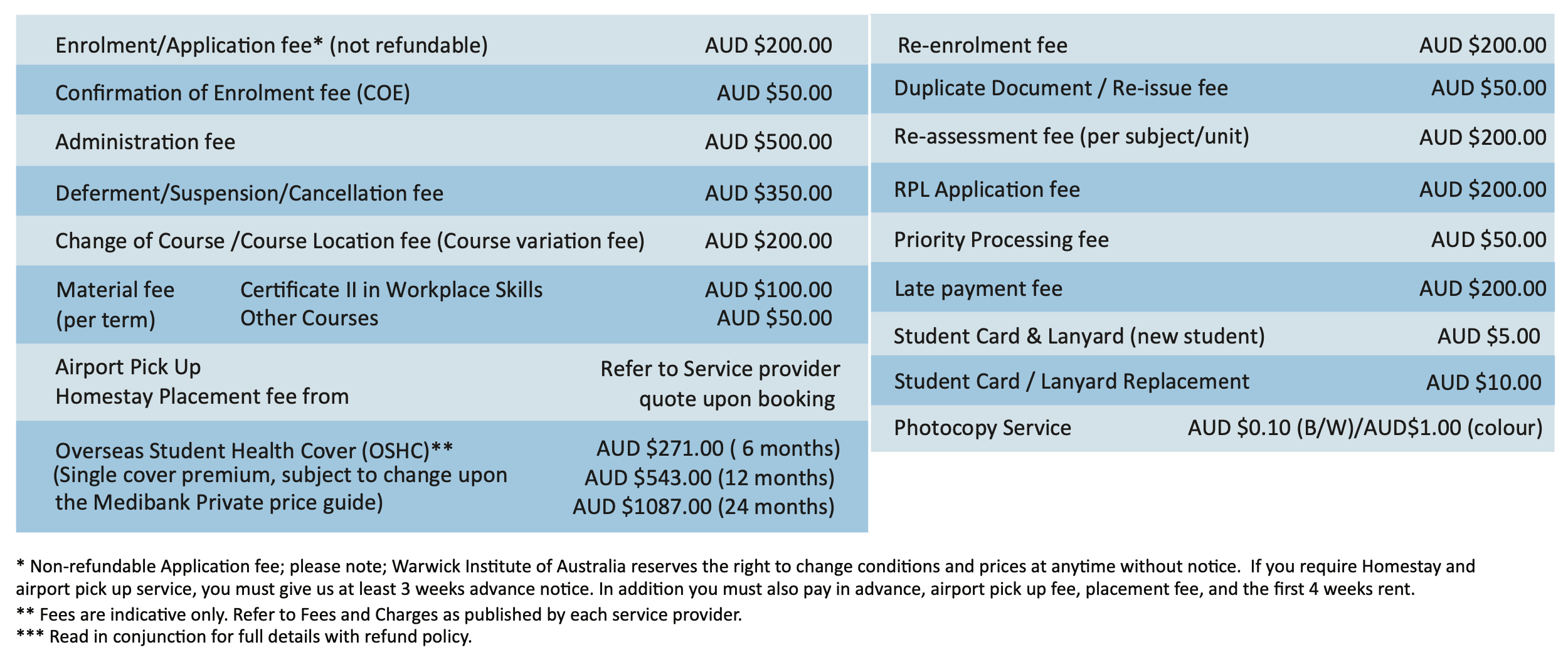 Warwick Institute of Australia is not responsible for any tuition fee paid to a third party’s bank account. All payments must be made to an authorised education agent or directly to our bank account.